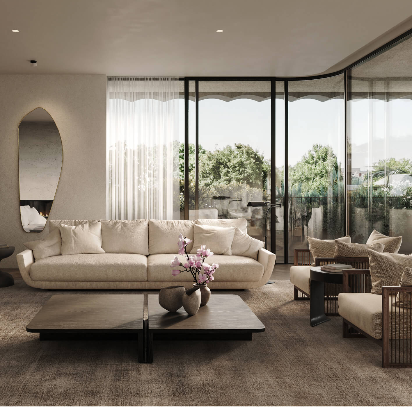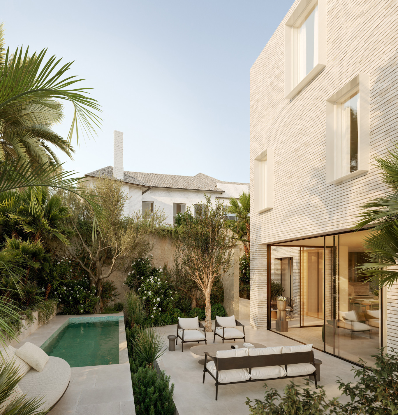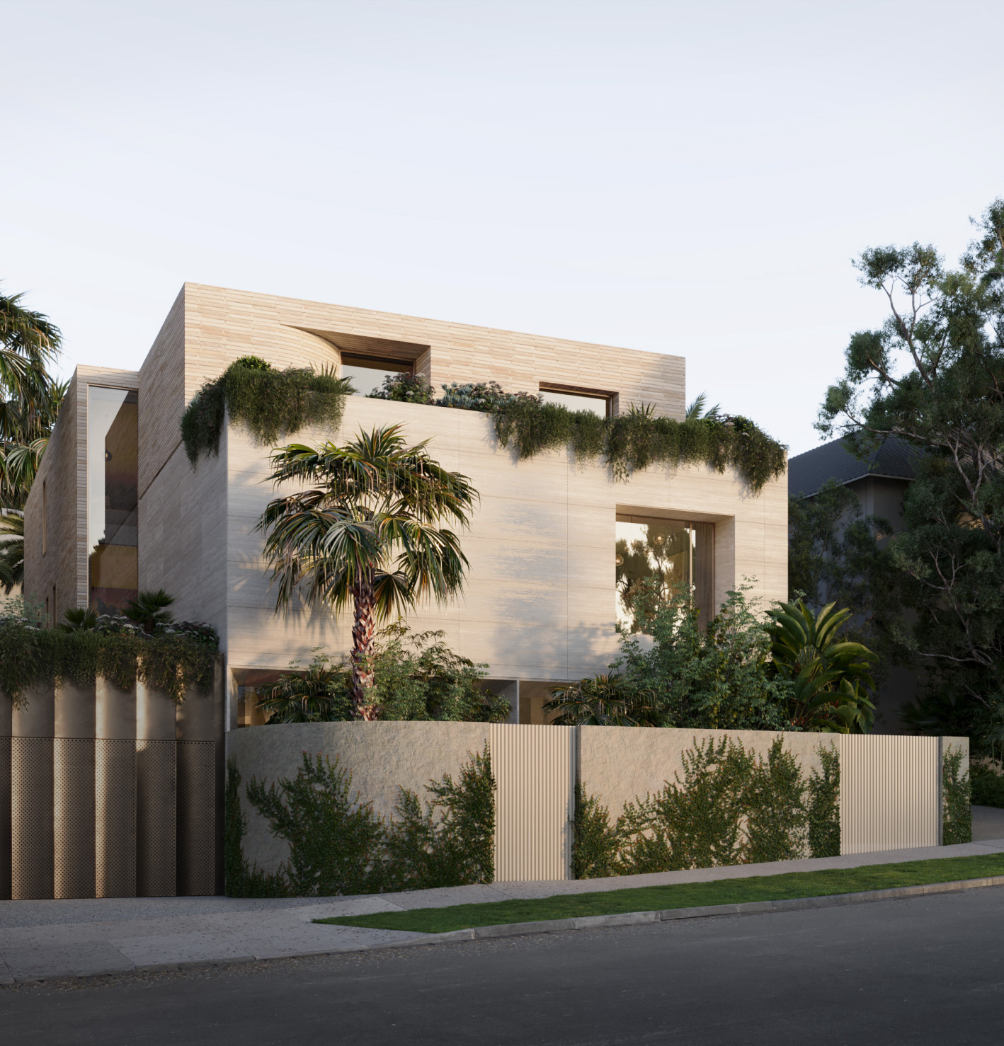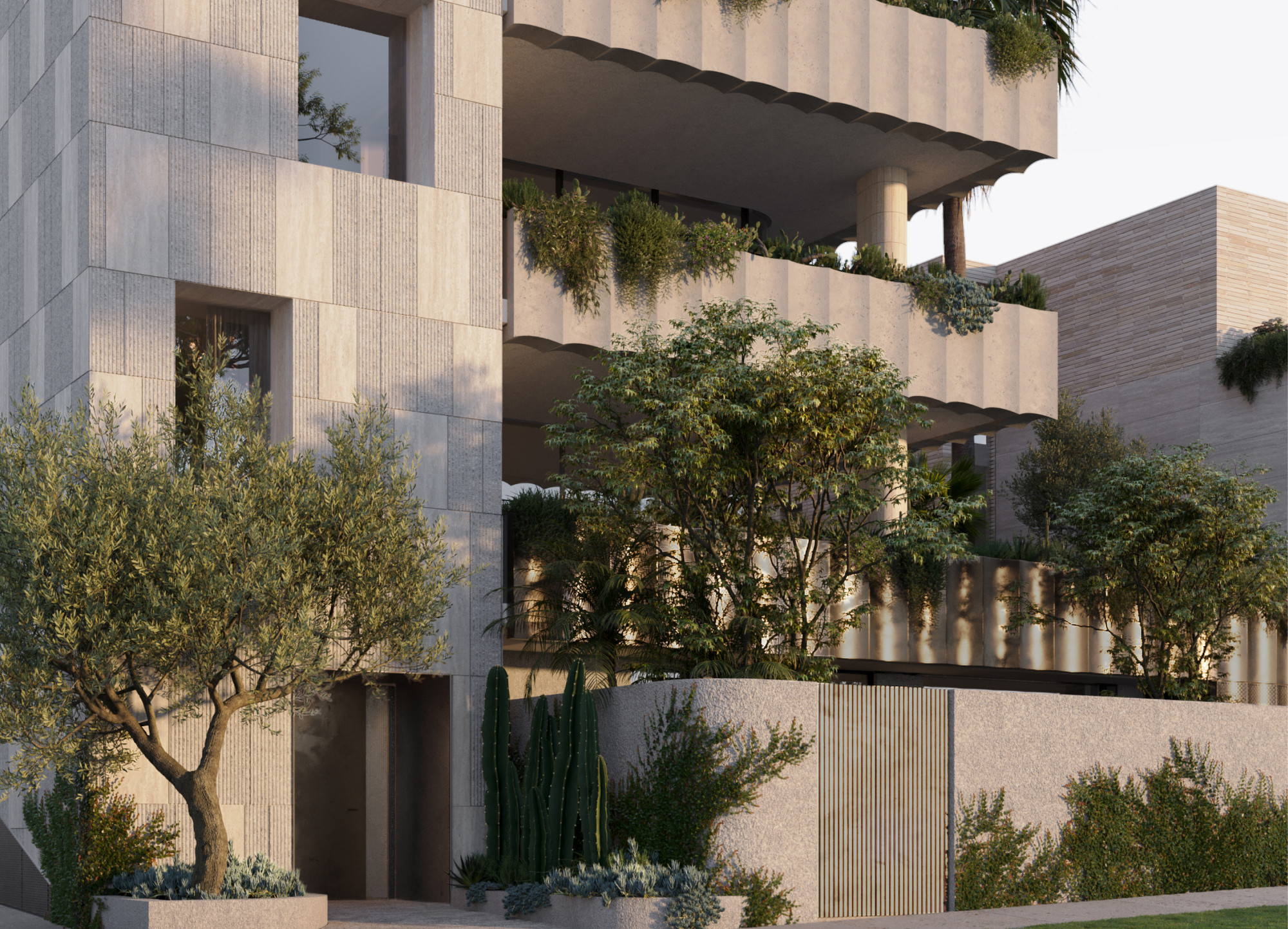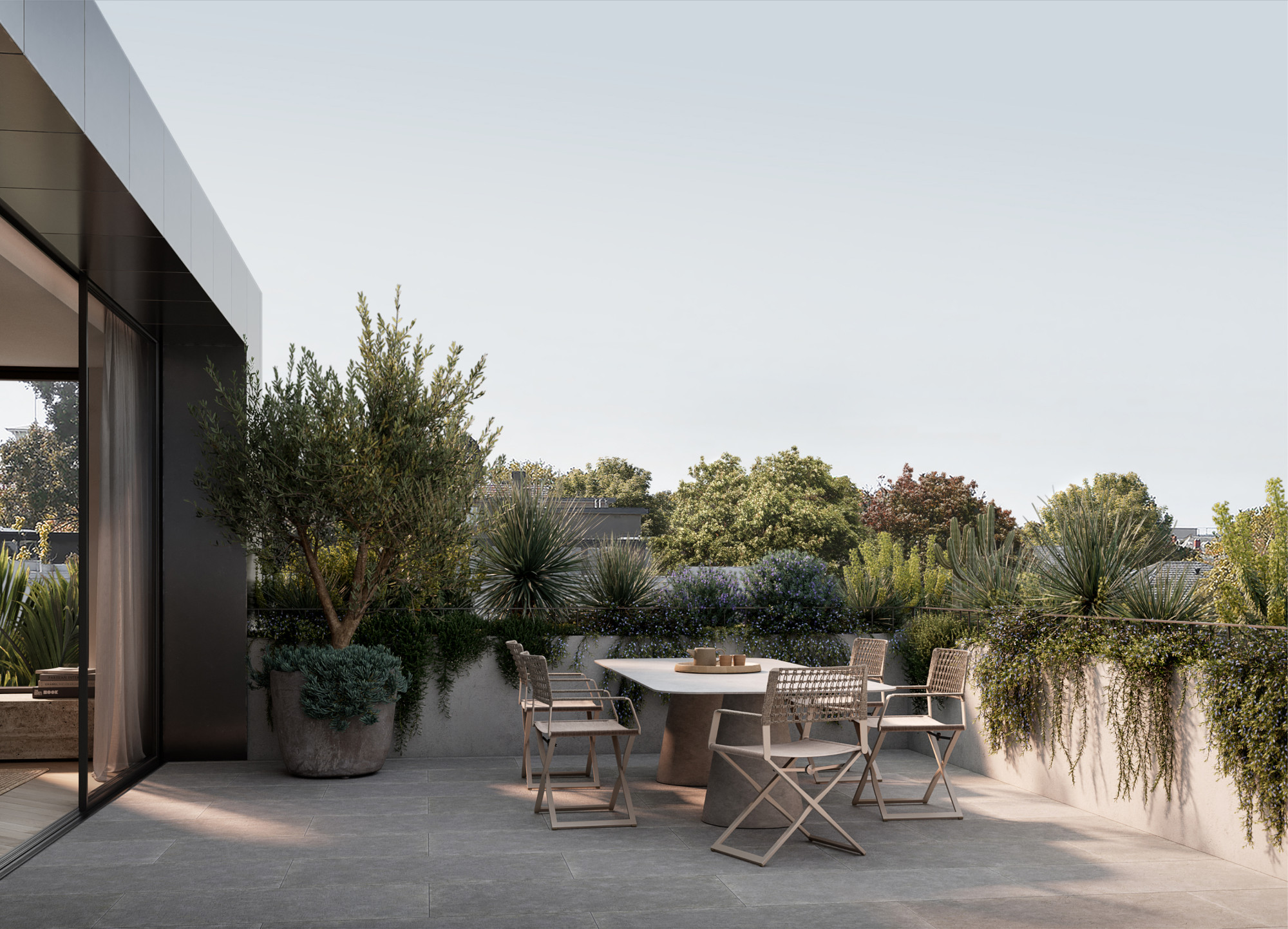 Purposeful design balances solid forms and a restrained palette of natural materials with sculptural elements and deep terraces fringed by greenery. The result is a building offering both privacy from the street and a sense of openness from within.